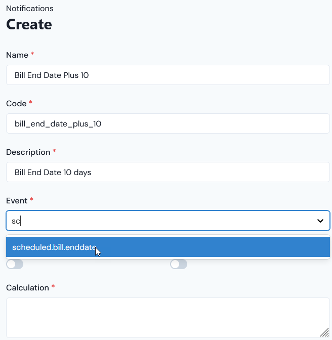 If you go to Notifications>Create Notification Rule in the Console, on the Create form your new custom Scheduled Event will show for selection in the Event drop-down for the same name as you used to create it. For the example shown in the previous section of this topic, this Event name is scheduled.bill.enddate, and you can start to enter this name to filter the drop-down Event list: