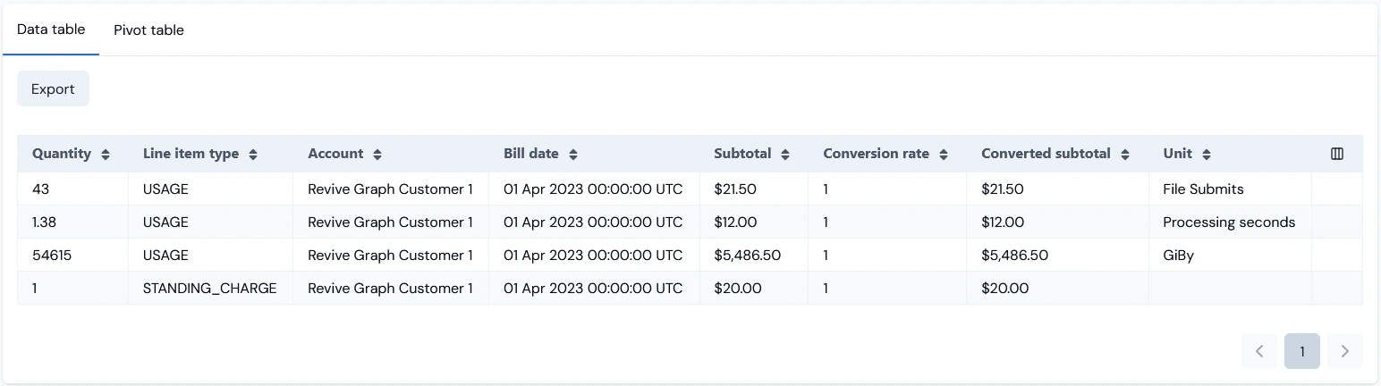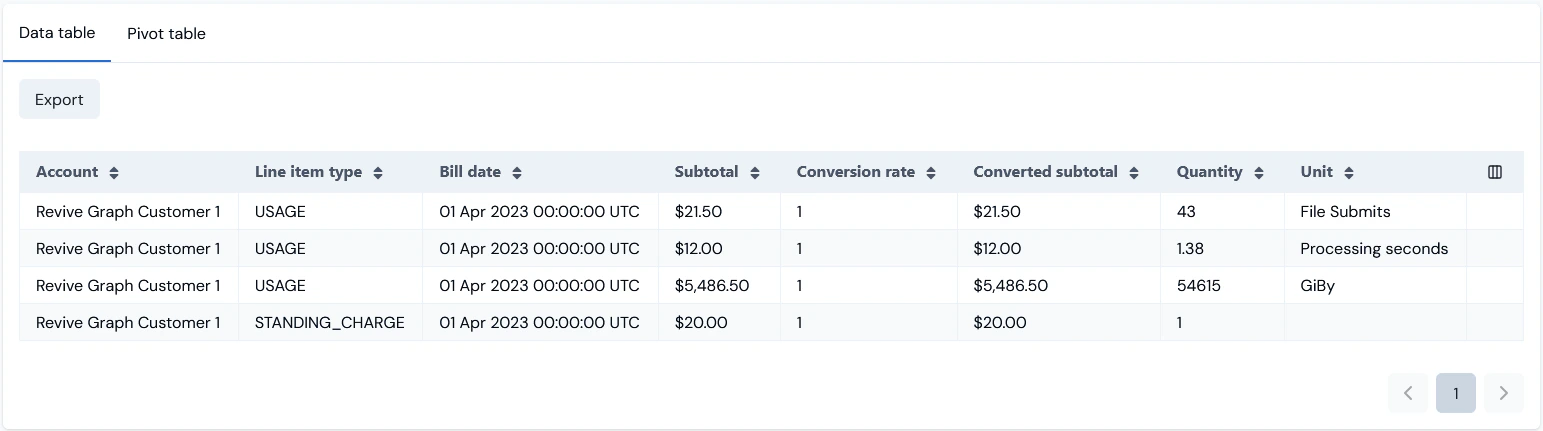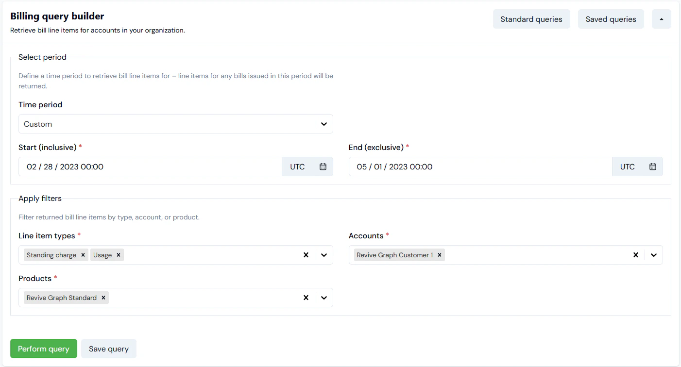 - Selected a single Account and a single Product to return Billing data for.
