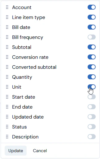 - Selected values. Use the drop-down to select the Bill line item types for which you want to return Billing data.