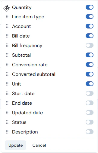 - Select Update. The panel closes and the Data table refreshes for the selected column order: