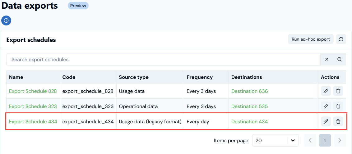 - Usage data (legacy format) Export Schedules? If you were an early customer of Data Exports you might also still have access to the legacy usage format for data Export Schedules. However, the legacy usage format is NOT available for new customers - please see Creating Usage Data Export Schedules.