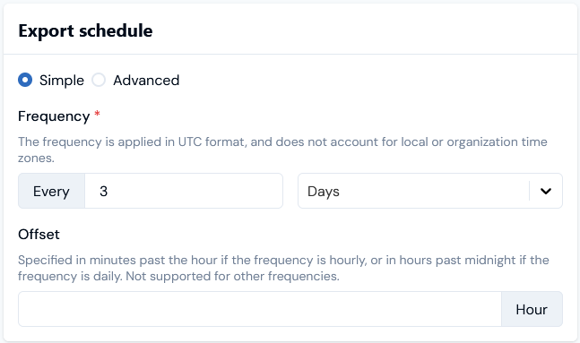 Offset. If you use an hourly or daily frequency, then you can define an offset for when the export will run relative to the hour or day: