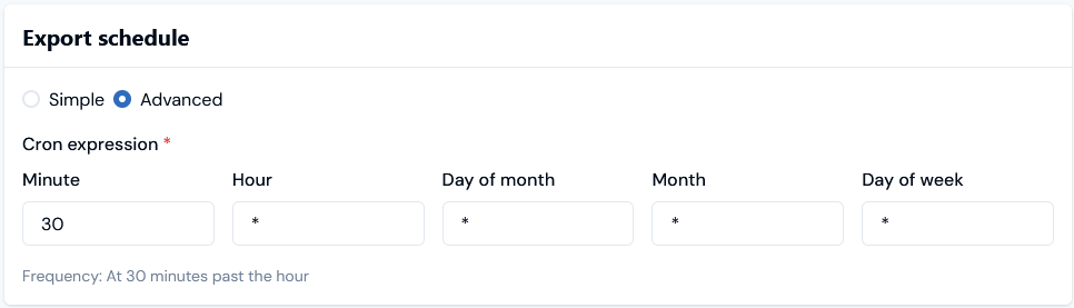 - Alternatively, select the Advanced scheduling mode and define a cron expression for when you want the export to run: