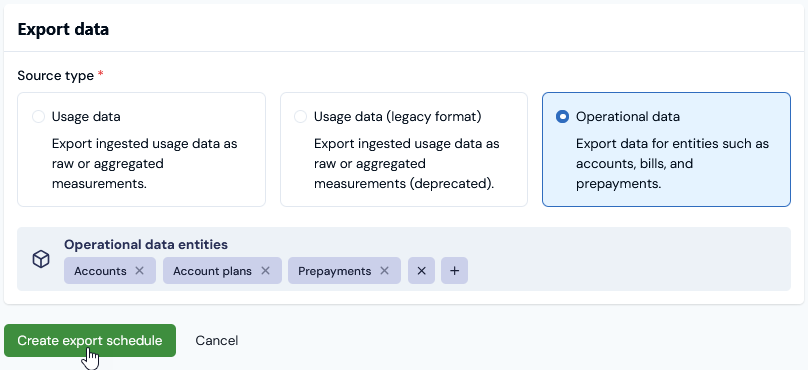 You can quickly set up scheduled exports of operational data such as Accounts, Bills, and Balances. Scheduled exports are incremental and designed to be easily integrated into downstream data tools. To create an Operational Data Export Schedule:- Select Data exports: