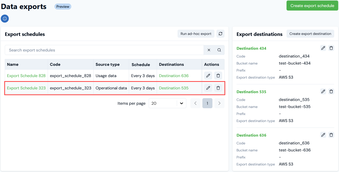 - Return to the Data exports page where the new schedule is listed on the Export schedules panel: