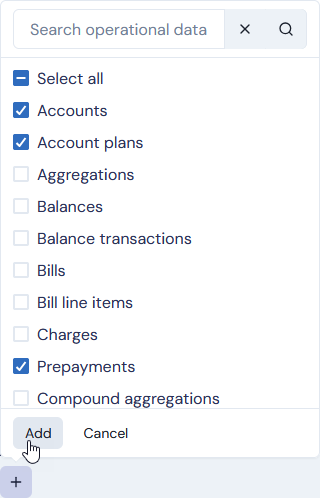 - Under Operational data entities, select the plus icon and use the pop-up to select the entities whose data you want to include in the export: