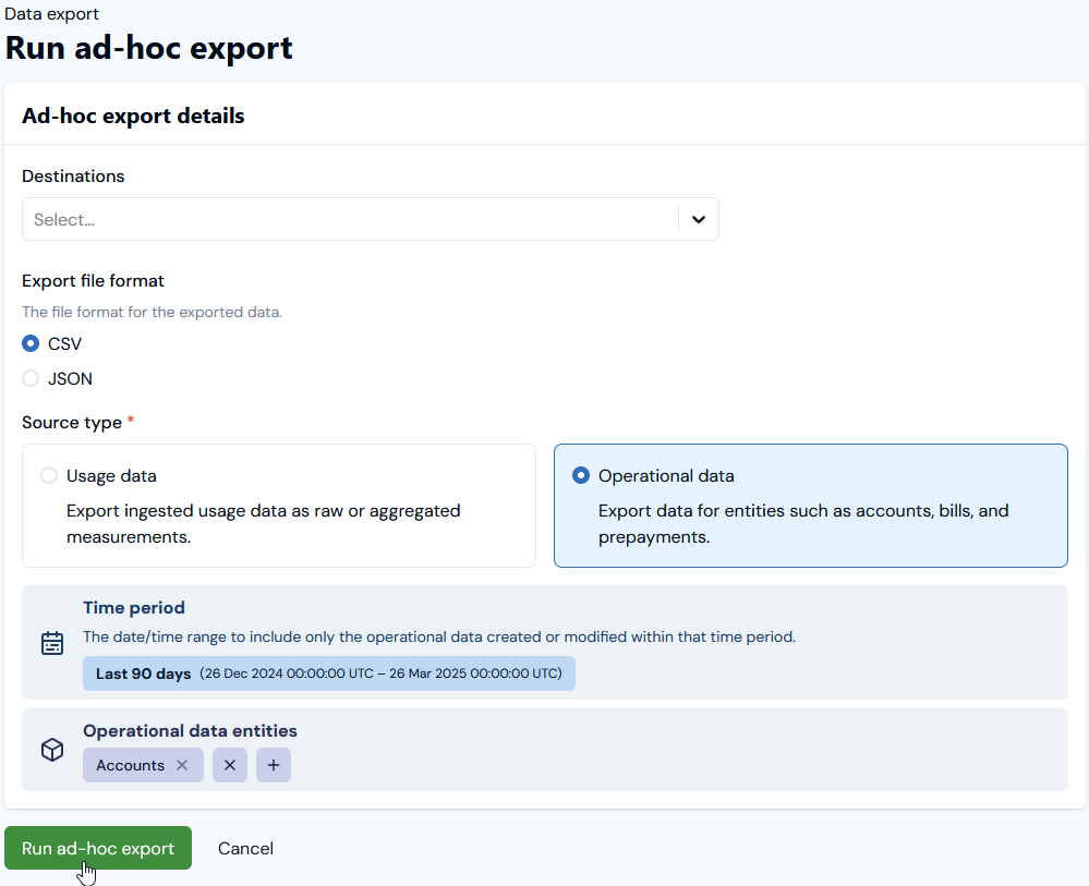 - Follow the steps to configure an ad-hoc data export given in the above Running Ad-Hoc Operational Data Exports topic, but note that you can omit selection of a Destination for the export: