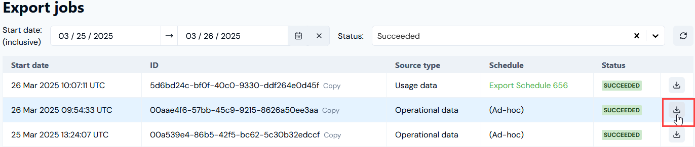 - When the Export job has run and succeeded, you can use a Download button for the export file: