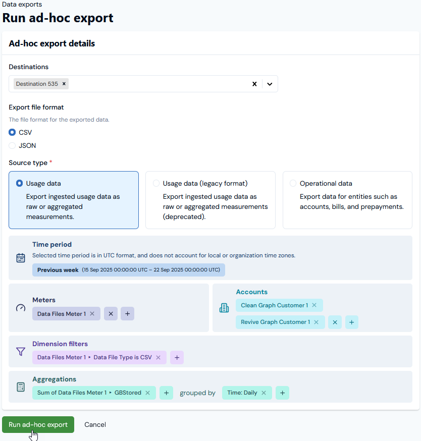 - In this example, we’ve selected a single Meter and two Accounts for which filtered and aggregated usage data grouped daily will be included in the ad-hoc usage data export.