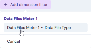 - Select the Meter Dimension field you want to use to filter the data returned for the export. For the current example, we’ll select Data Fields Meter 1 > Data File Type. A dialog replaces the menu, which lists values used for this field when usage submissions were made for the Meter within the selected Time period.