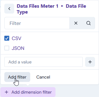 - Check the values used for the selected Meter Dimension field you want to use to filter the data returned for the export and then select Add filter: