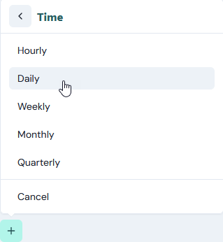 - Select the time period you want to group the data by. The dialog closes and your grouped by selection is added under Aggregations.