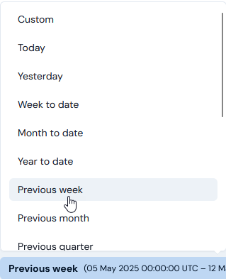 - Previous week, month, quarter, year. Data collected for the previous full week, month, quarter, or year period. For example, weeks run Monday to Monday - if the export is run on June 12th 2024, which is a Wednesday, the export will contain data for the period running from Monday, June 3rd to midnight on Sunday, June 9th 2024.
