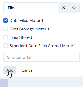 - Select the plus icon. A popup will show listing all Meters in your Organization and you can search the list.