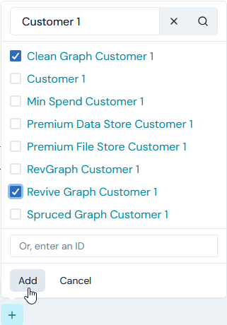 - Select the plus icon. A popup will show listing all Accounts in your Organization and you can search the list.