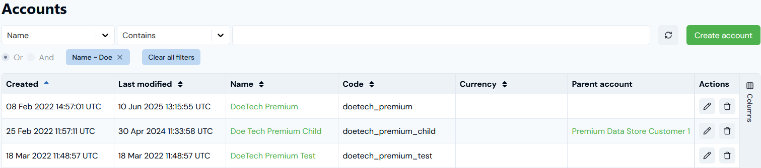 - Select Columns again. The Columns panel closes and the Accounts page shows the columns you have switched on: