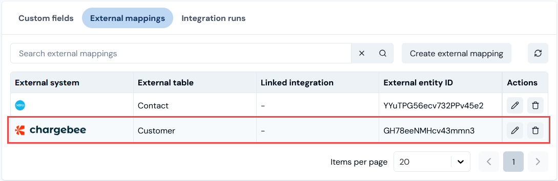 - The External system and External table mapped to are shown - such as Xero - Contact in the above example. The External entity ID mapped to is also shown.