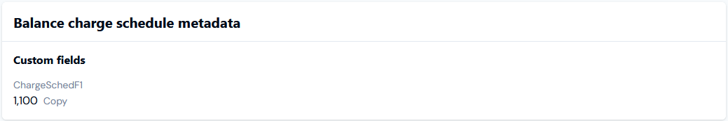 - Scroll further down the page and on the Balance charge schedule metadata card you can review any Custom Fields created for the Charge Schedule: