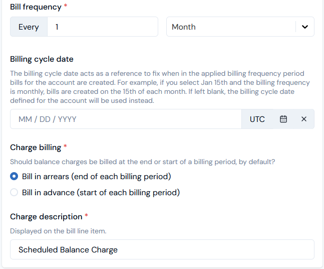 Billing cycle date*.* Optional setting, which sets the date when the first Bill is created for Balance Charges under the Schedule, and also acts as a reference for when in the Schedule period subsequent bills are created: