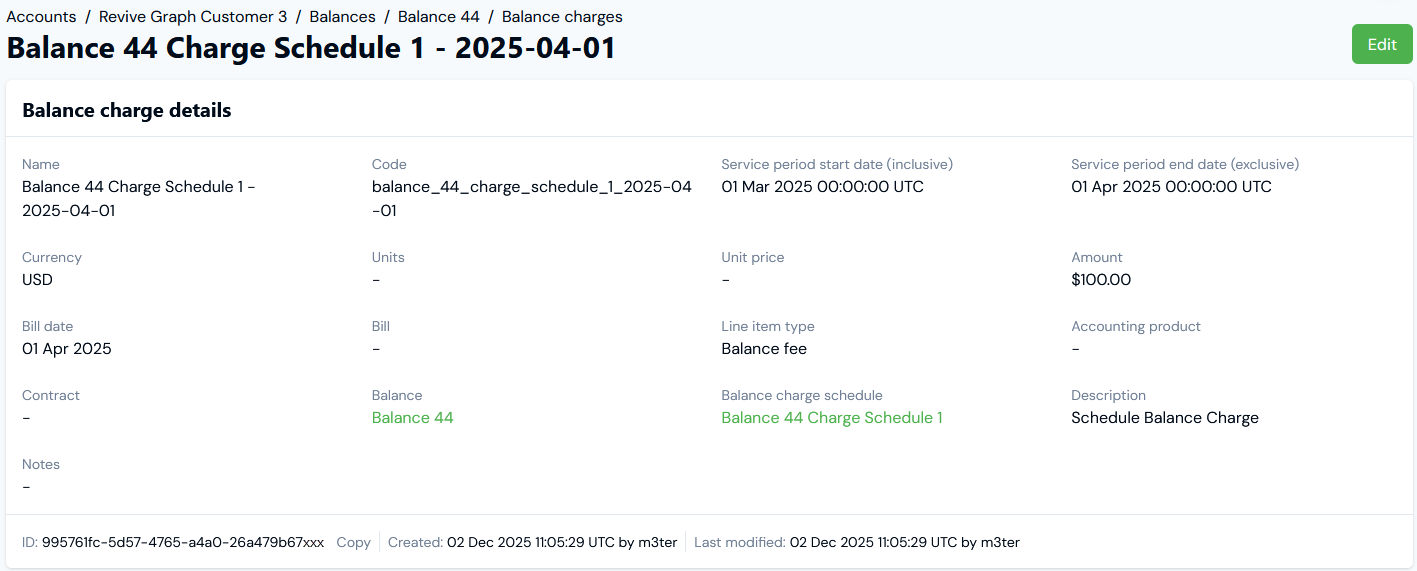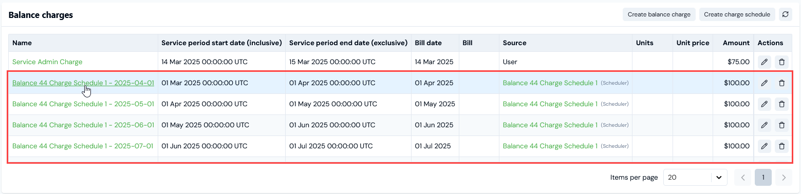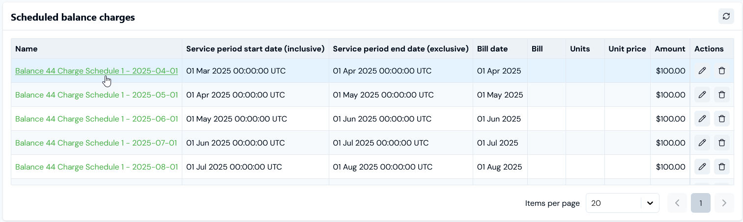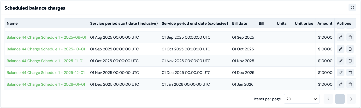 - Scroll down the page and on the Balance charges card, any Charges created for the Balance - either one-off Charges or Scheduled Charges are listed: