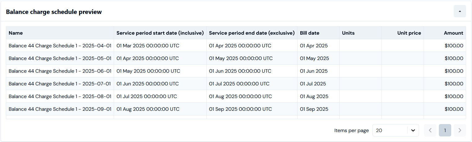 - If you want to check the Charges that will be created for the Balance under the Charge Schedule configuration, expand the Balance charge schedule preview.