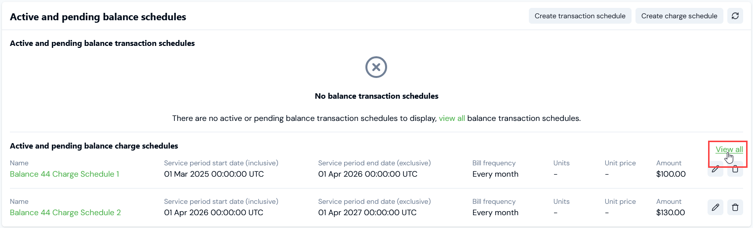 - Return to the Balance details page. If a Balance has multiple Charge Schedules set up, from the Active and pending transaction schedules panel you can select to View all: