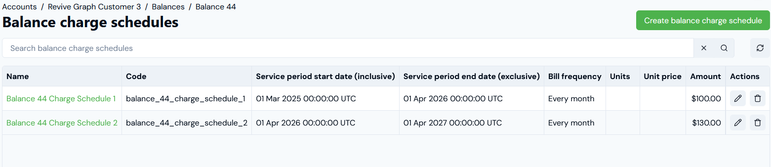 - Select Create balance charge schedule. You are returned to the Balance details page where the new Charge Schedule is listed on the Active and pending balance schedules panel under Active and pending balance charge schedules: