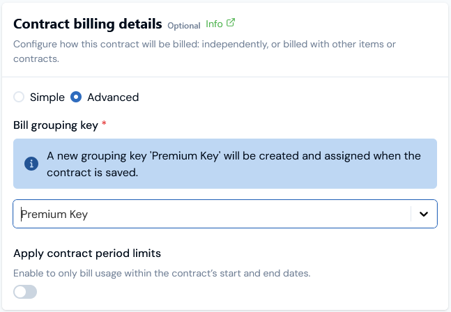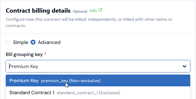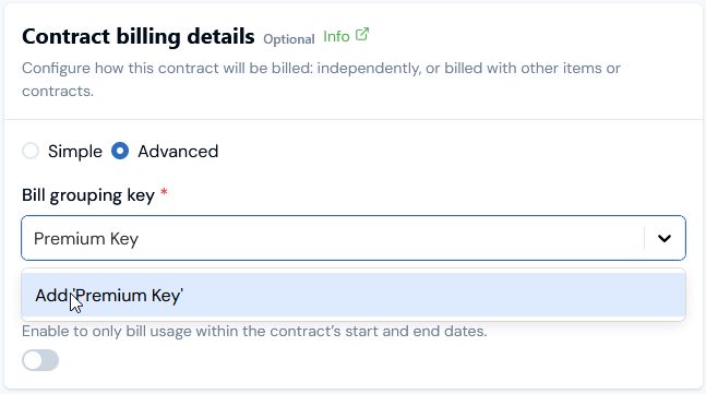 - On the Contract billing details card, select Advanced. The card adjusts to show a Bill grouping key selection/add drop-down: