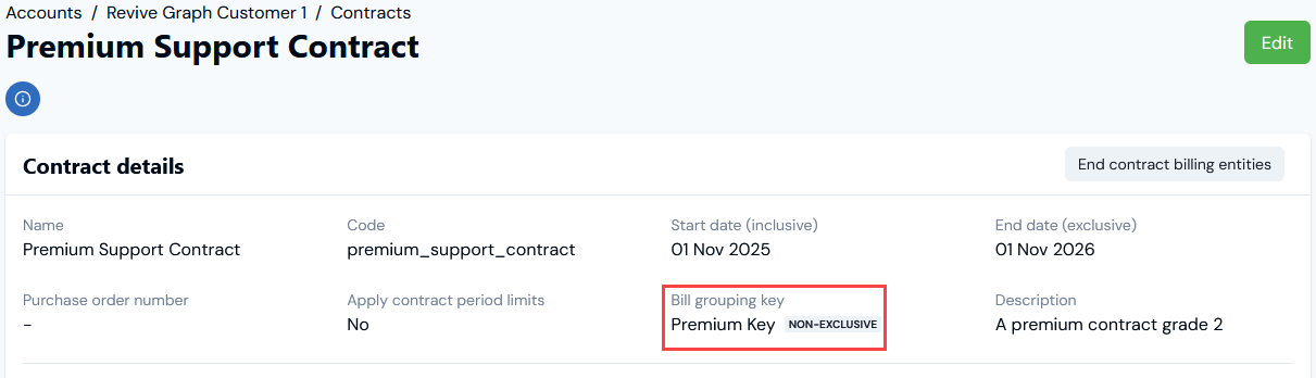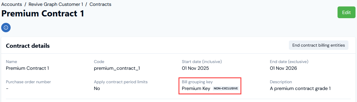 - The Bill grouping key we added has been created, assigned to the Contract, and is marked as NON-EXCLUSIVE.