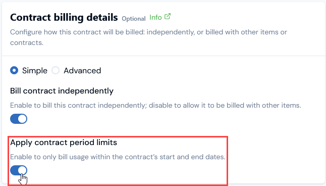 When you create or edit a Contract that you’ve enabled for billing, you can restrict the charges billed to the period you’ve defined for the Contract using the Apply contract period limits switch on the Contract billing details card: