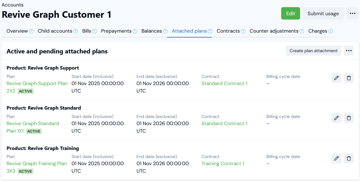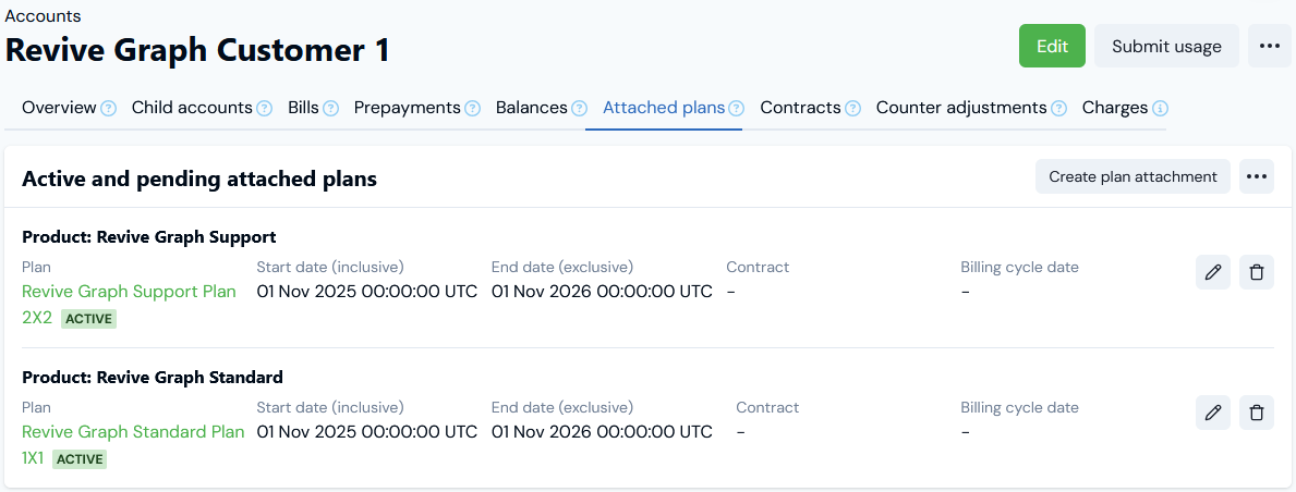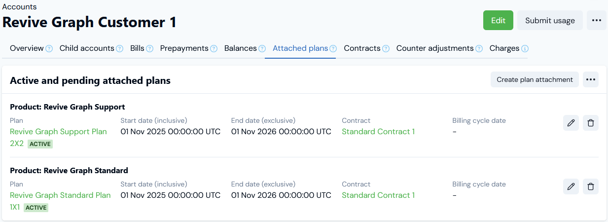 - In this example, we’ve attached two priced Plans for billing the Account for consumption of two different Products.