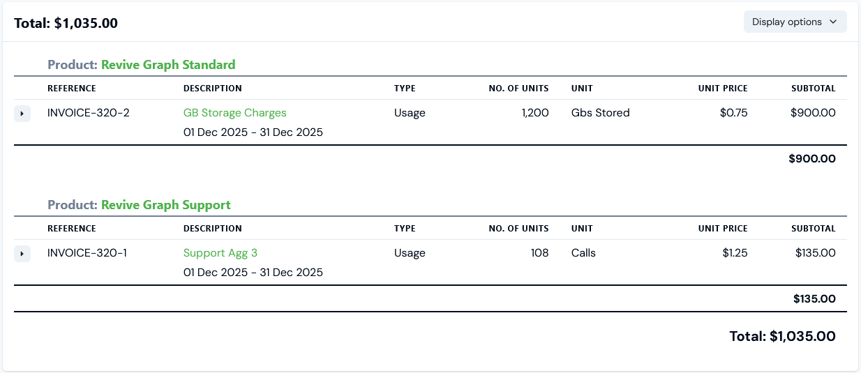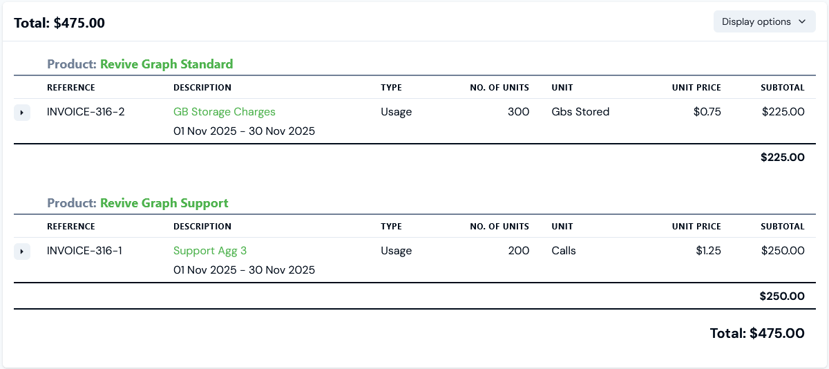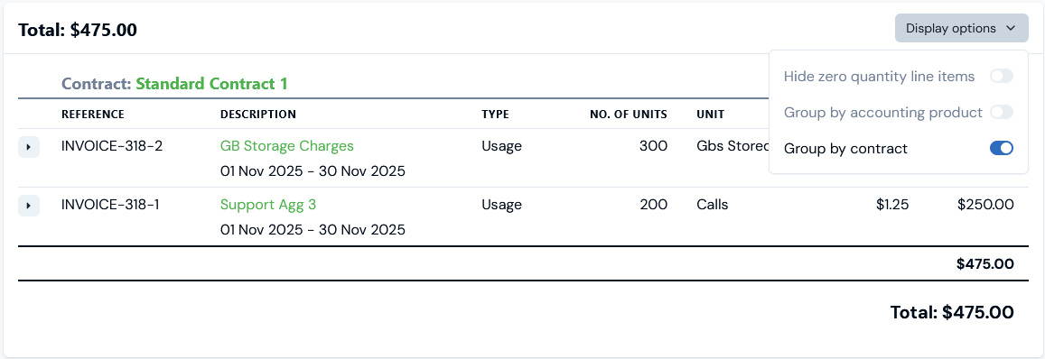 - We can see the Bill has been correctly calculated for the usage submitted for each of the Products and we can then use the Group by contract switch on Display options: