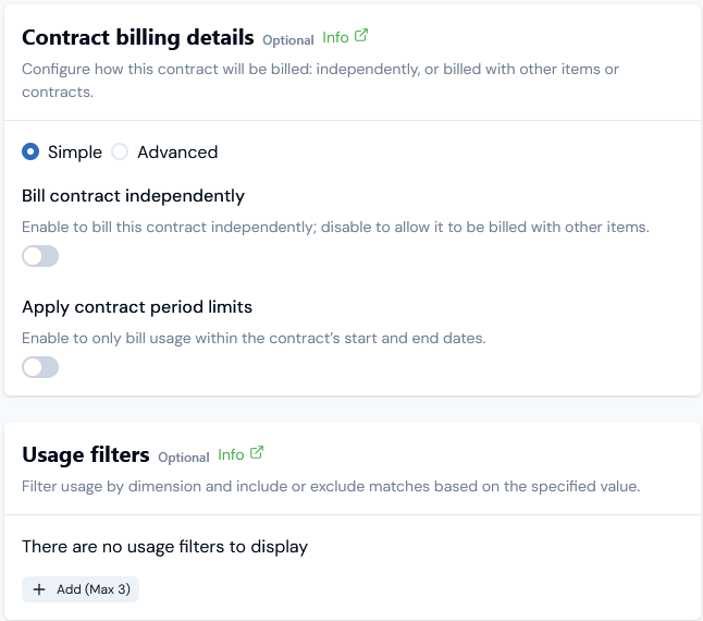 As a further option for controlling Contract billing and giving added flexibility, when you enable a Contract for billing you can configure usage filters for the metered usage and charge at billing only for usage where Product Meter dimensions equal specific defined values. When you create or edit a Contract you’ve enabled for billing, you can define Usage filters to either include or exclude charges for usage associated with specific Meter dimensions: