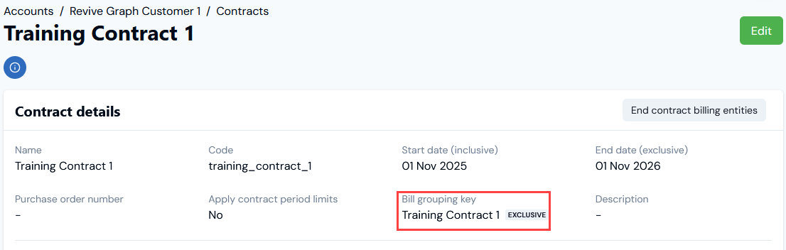 - For the example, we can now see that a Bill grouping key using the Contract’s name has been created, assigned to Training Contract 1, and is marked as EXCLUSIVE.