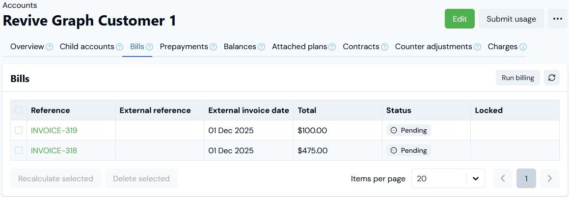 - Select the Bill that was generated without usage filters applied to the Contract and select Recalculate selected.