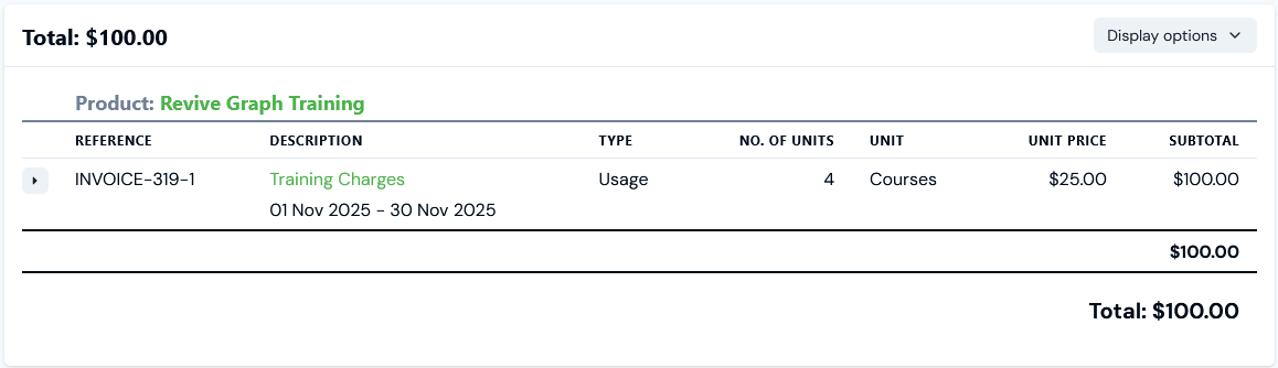 - The Training Contract 1 Bill opens with line items grouped by the single Product for the attached Plan added to the Contract and we can then use the Group by contract switch on Display options: