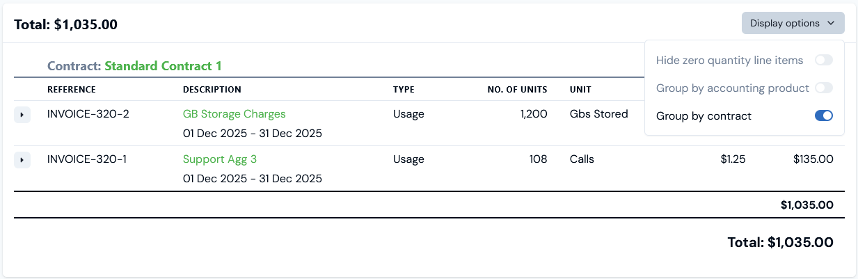 - The Standard Contract 1 Bill opens with line items grouped by the two Products for the attached Plans added to the Contract and we can then use the Group by contract switch on Display options: