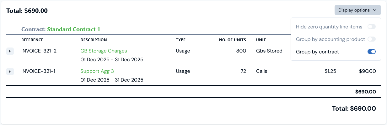 - The Bill has been correctly recalculated for the filtered usage submitted for each of the Products. We can then use the Group by contract switch on Display options: