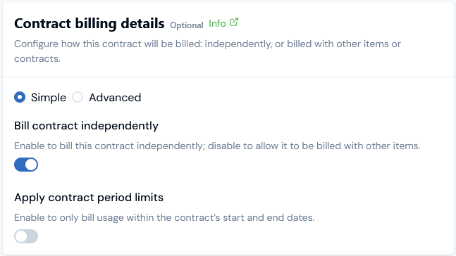 - On the Contract billing details card, enable the Bill contract independently switch:
