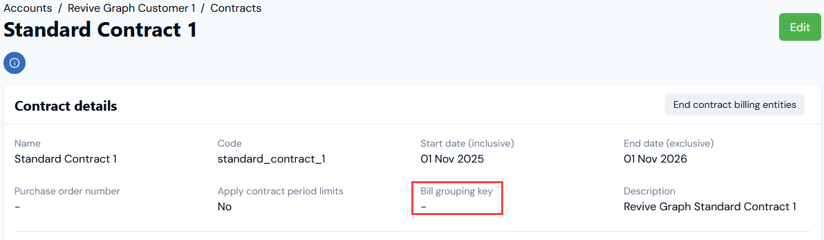 - We can see that no Bill grouping key is assigned to the Contract.