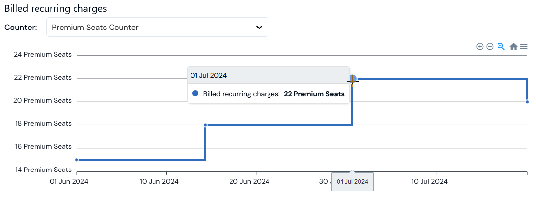 - The Counter values used for billed recurring charges are loaded into the chart, and you can hover over a data point to read-off a specific value: