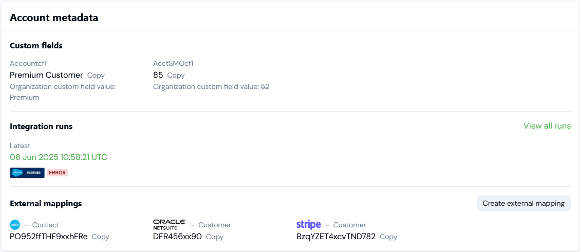 - Metadata for any Custom Fields or External Mappings created for the Account are shown.
