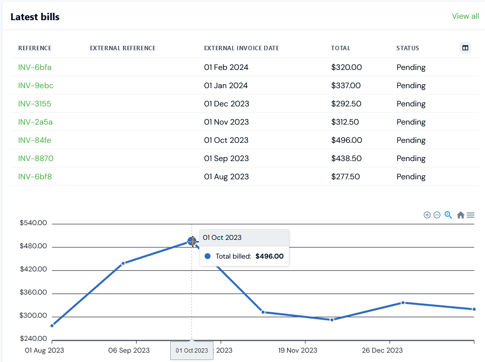 When you open an Account’s Overview tab, on the Latest bills card the latest ten Bills for the Account are listed ordered by Bill date with the most recent Bill at the top:- A chart tracking revenue for the Latest bills is also loaded: