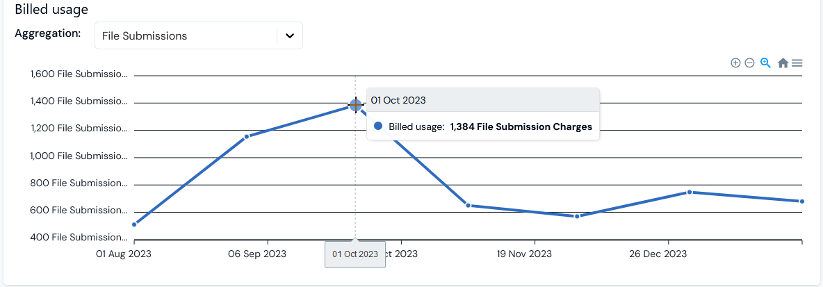 - The usage data measures used for billed usage are loaded into the chart, and you can hover over a data point to read-off a specific measure: