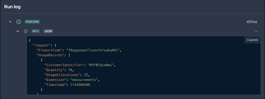 When Bill-based integration runs are performed, all interactions between m3ter and AWS Marketplace are persisted as logs. These logs are retrievable via a specific API endpoint, and you can use them to track, for each Bill, all amounts sent over to AWS Marketplace, together with the date and time the Bill data was sent. This provides a report on usage data sent to AWS Marketplace for each Bill integration run, and is particularly useful for Bill recalculation scenarios where several updates might have taken place during the billing period.- API Endpoint: Retrieve Reported Usage