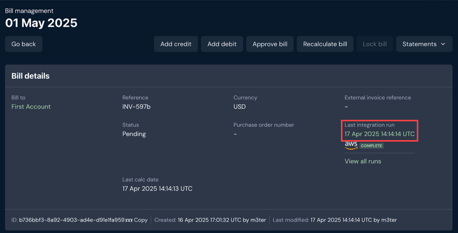 If you’ve set up an integration with an external system, m3ter allows you to review details of the integration runs that have been performed for the integration. For any Bills that have been included in an AWS Marketplace integration run, you can access and review details of the run directly from the Bill details in Bill management. For example: