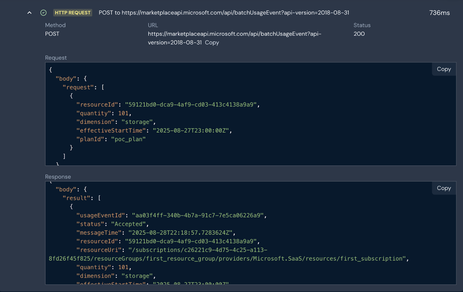 When Bill-based integration runs are performed, all interactions between m3ter and Azure Marketplace are persisted as logs. These logs are retrievable via a specific API endpoint, and you can use them to track, for each Bill, all amounts sent over to Azure Marketplace, together with the date and time the Bill data was sent. This provides a report on usage data sent to Azure Marketplace for each Bill integration run, and is particularly useful for Bill recalculation scenarios where several updates might have taken place during the billing period.- API Endpoint: Retrieve Reported Usage