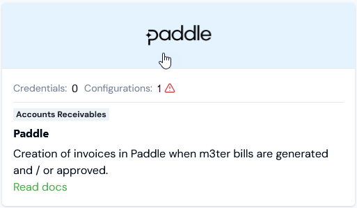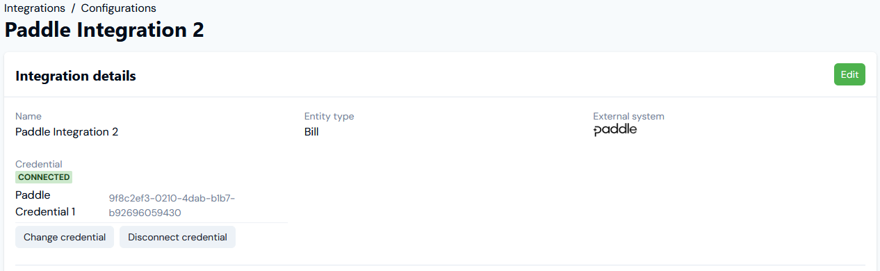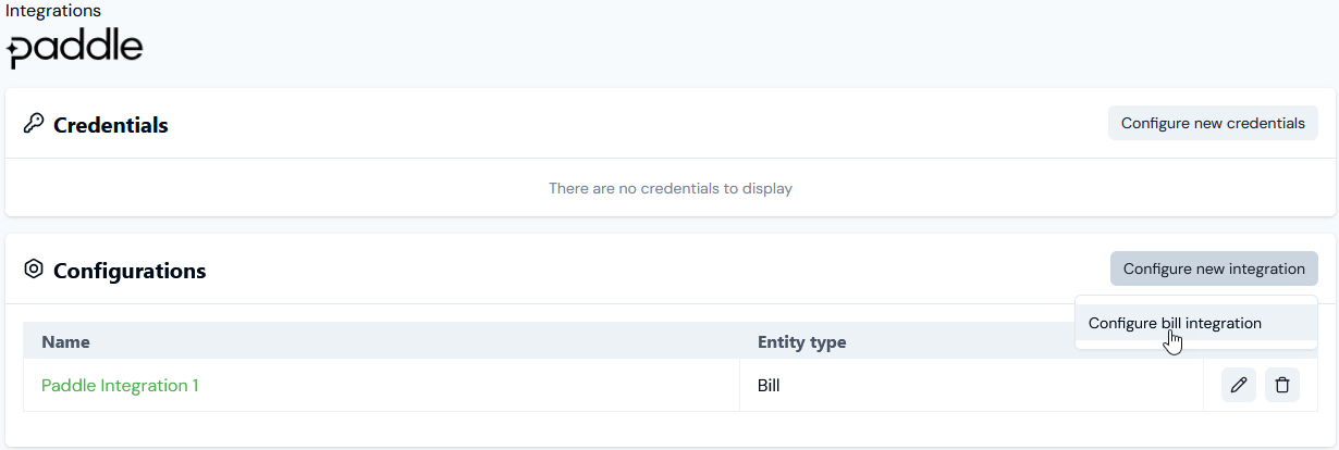 - Select Create integration. You are returned to the Integrations>Paddle page, where the integration is listed on the Configurations panel: