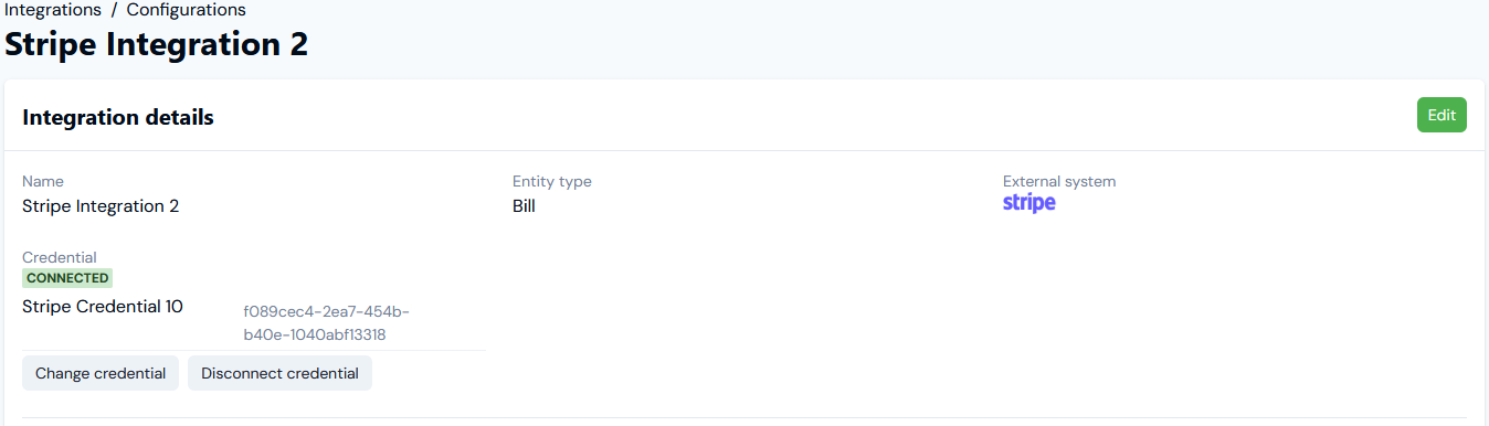 - On the Configurations panel, select the Name hotlink text of the Stripe integration you want to set up authentication for. The Integration details page opens: