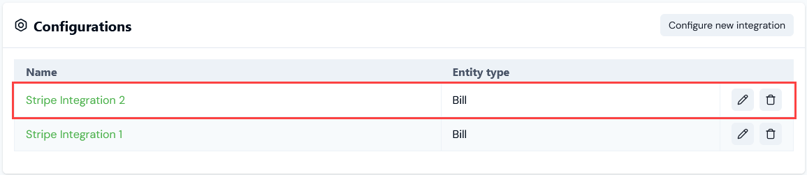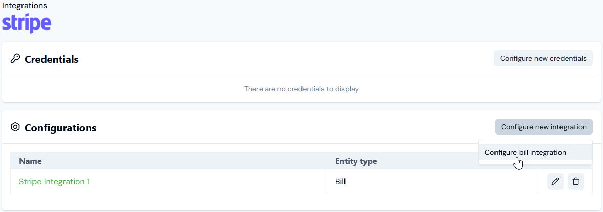 - Select Create integration. You are returned to the Integrations>Stripe page, where the integration is listed on the Configurations panel: